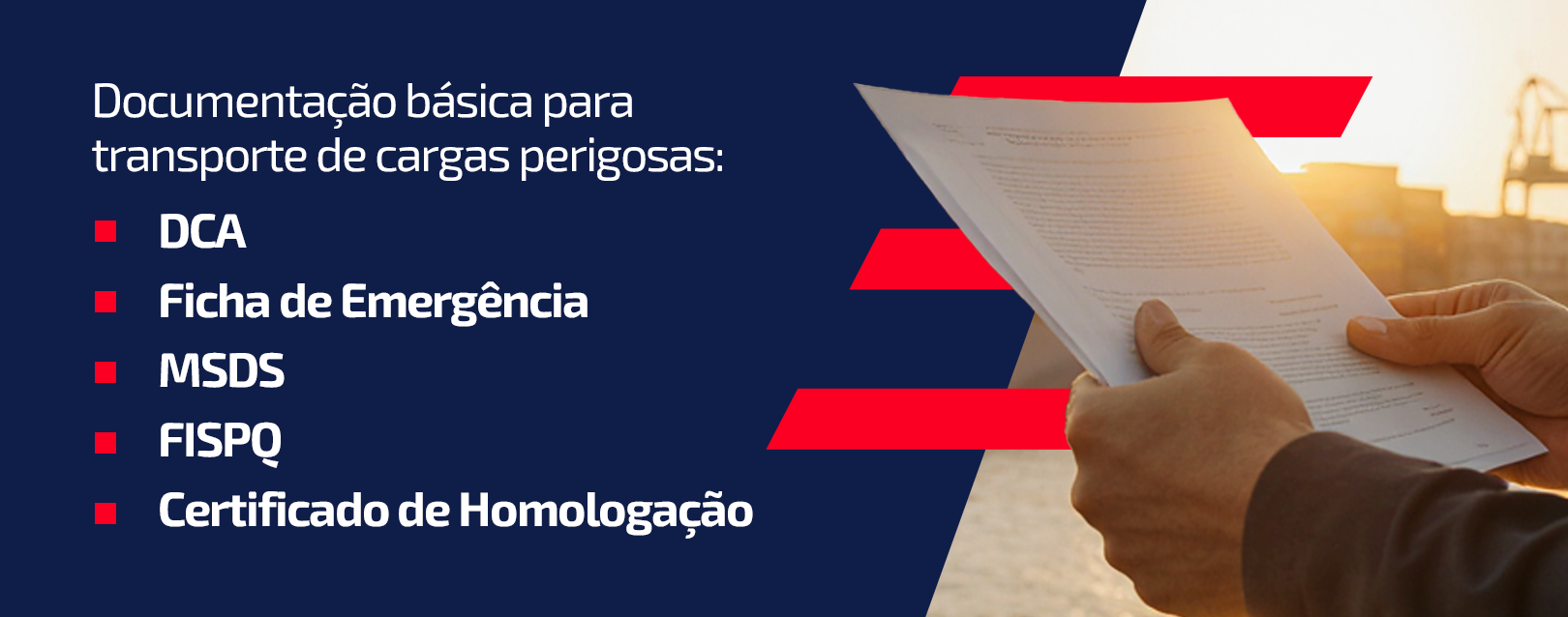 Entre os documentos essenciais estão o DCA, MSDS, FISPQ, Ficha de Emergência e Certificado de Homologação.